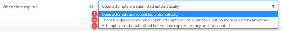 When time expires : กำหนดค่าเมื่อหมดเวลาทำข้อสอบ ซึ่งอาจเกิด เหตุการณ์ที่ผู้สอบยังทำข้อสอบไม่เสร็จ หรือยังไม่กดส่งคำตอบ ได้แก่