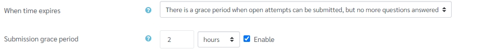 2) There is a grace period when open attempts can be submitted, but no more questions answered -> ผู้สอบสามารถกดปุ่ม Submit เพื่อส่งข้อสอบ หลังเวลาทำข้อสอบหมดลงไปแล้ว ในช่วงเวลาผ่อนผันที่กำหนด แต่จะไม่สามารถทำข้อสอบเพิ่มได้ โดยจะมีการตั้งค่าเพิ่มเติมให้กำหนดระยะเวลาที่สามารถส่งข้อสอบได้ หลังจากเวลาทำข้อสอบหมดลงไปแล้ว